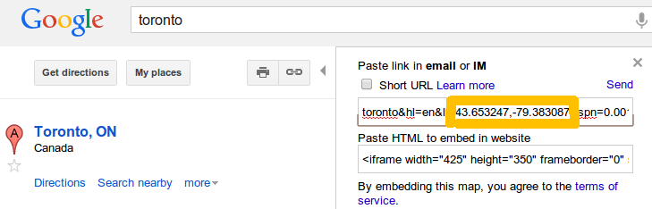A: Before you go to GPS2OpenGTS tests first use manual tests and see what gets logged in logs/w-gprmc.log. Find a 2 places on Google Maps, let's say one in Chicago and one in Toronto. Zoom in Google Maps to a maximum and get decimal coordinates by clicking Link in the left panel. Take decimal latitude and longitude (the numbers following ll= parameter). In our case these are 43.653247,-79.383087.